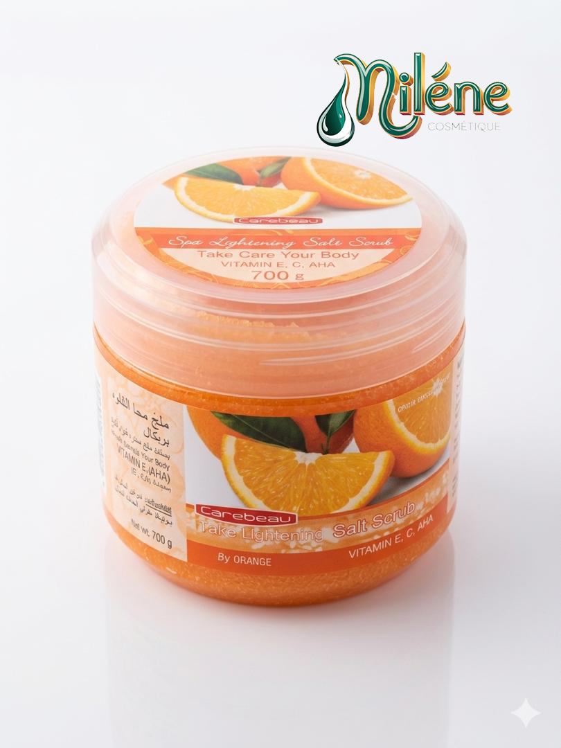 GOMMAGE CORPOREL CAREBEAU Révélez l’éclat naturel de votre peau avec le sel de gommage à base de Orange. Infusé à la vitamine E et aux AHA, ce soin exfolie en douceur pour éliminer les impuretés tout en laissant un parfum fruité irrésistible