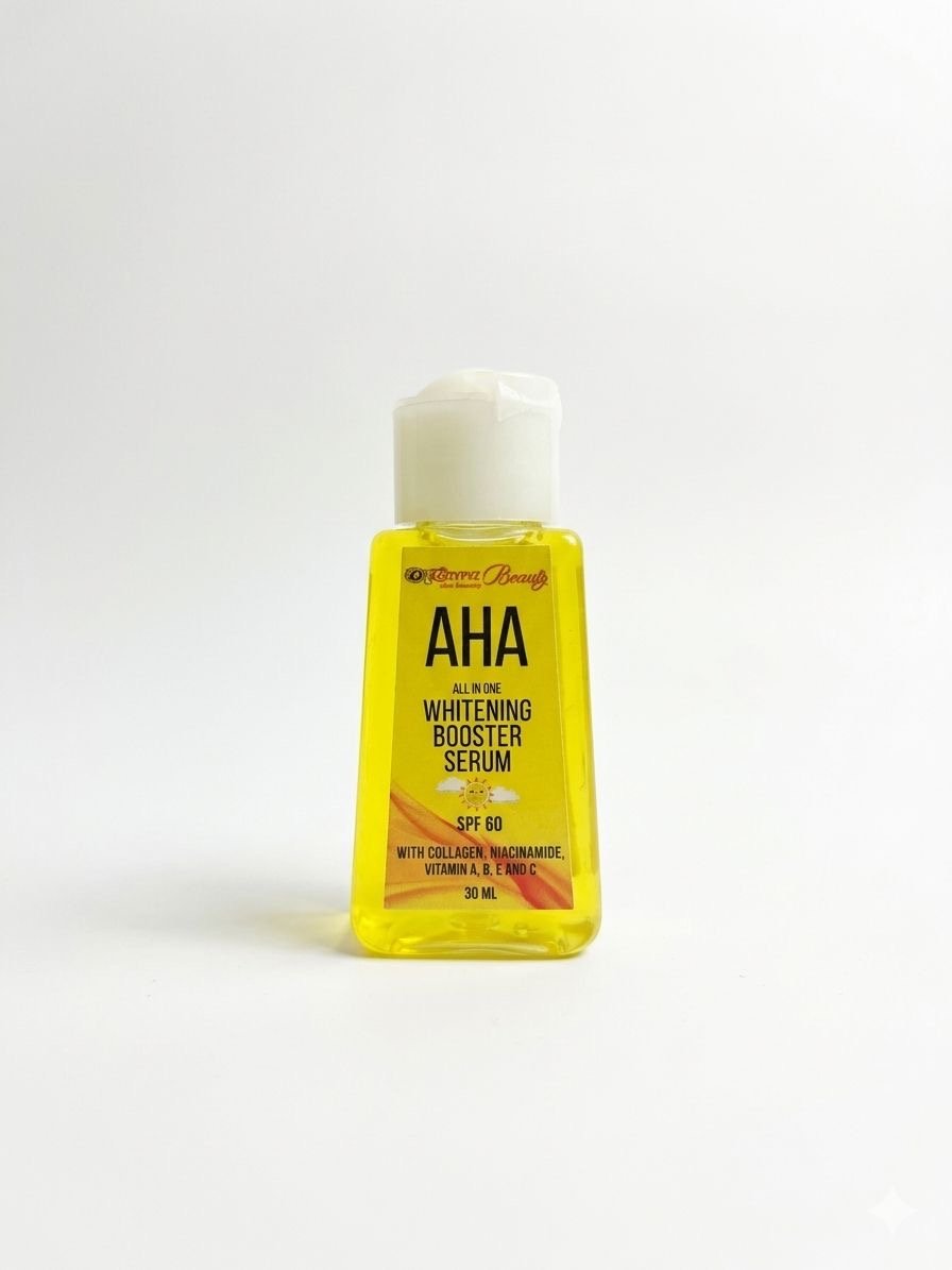 SÉRUM AHA WHITENING BOOSTER : Une formule puissante qui combine exfoliation et protection pour une peau visiblement plus claire et lisse. Action Éclat : Grâce aux AHA et à la Niacinamide. Soin Complet : Enrichi en Collagène et Vitamines (A, B, E, C). Protection : SPF 60 intégré pour sortir en toute confiance. Le secret d’un teint parfait dans un petit flacon de 30 ml